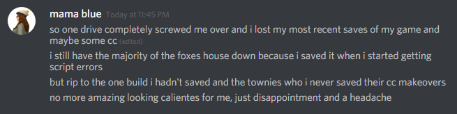 so i was having a fun time tonight with @ghosttox and bouncing ideas off each other when i decided to go in game (and i haven’t updated yet) and panicked because i didn’t see my saves there. the most recent one was from when i got my new computer back in november. so i realized it was because my one drive was full and i had turned syncing off. but the only way to move the files to a place on my computer, and not in one drive, meant that the stuff that hadn’t synced has been lost. BUT WHAT’S WEIRD is that i have all the cc i downloaded a few days ago, all the screenshots, everything that didn’t sync…except my most recent saves. i even have the .png files for the post i did yesterday, but not the save i captured it in. the most recent save i now have is from 20 days ago, so not a huge loss at the rate i’ve been playing lately, but it means i’ve lost townie makeovers i didn’t save to the gallery and a build i was working on too. *sigh* i’m just so done right now